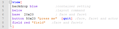 There is also the container settings, which describe how the window itself should look like. And both the container settings and the layout commands may allow further detailing, like its size, color etc. Faces not only allow this detailing (called facets in Red's jargon) but also may allow a block of commands to be performed by the face (called "action facet") in an event, e.g. the click of a button.